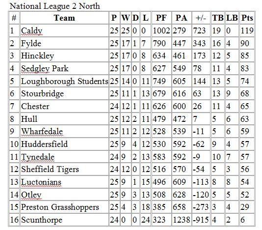 RFU National 2 North Table