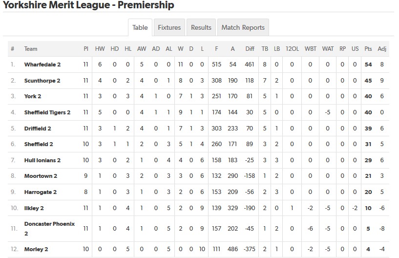 Yorkshire RFU Merit League - Premiership Table (For Conference Split 31/12/2019)